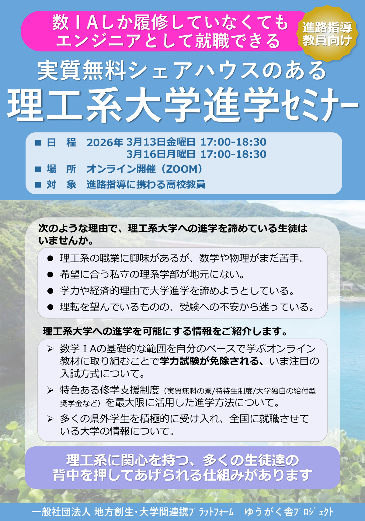 下記の日程・内容で理工系大学進学セミナー(オンライン)の開催を予定しています。